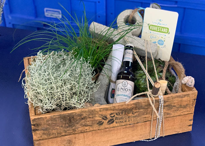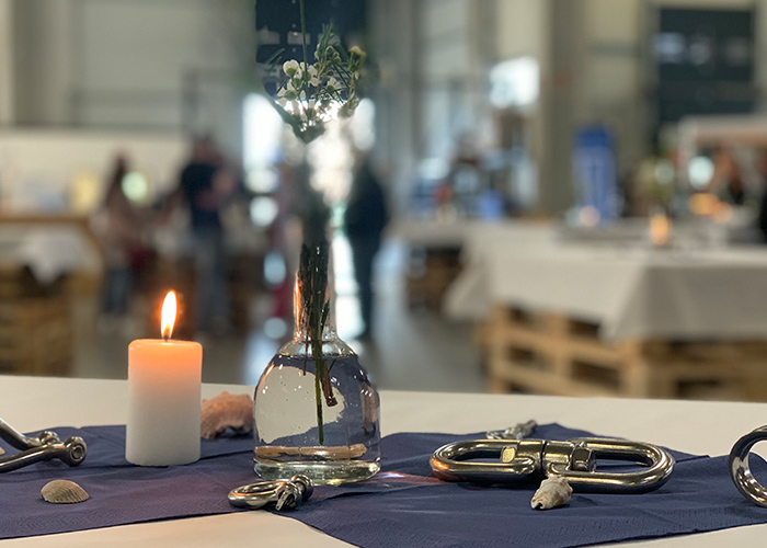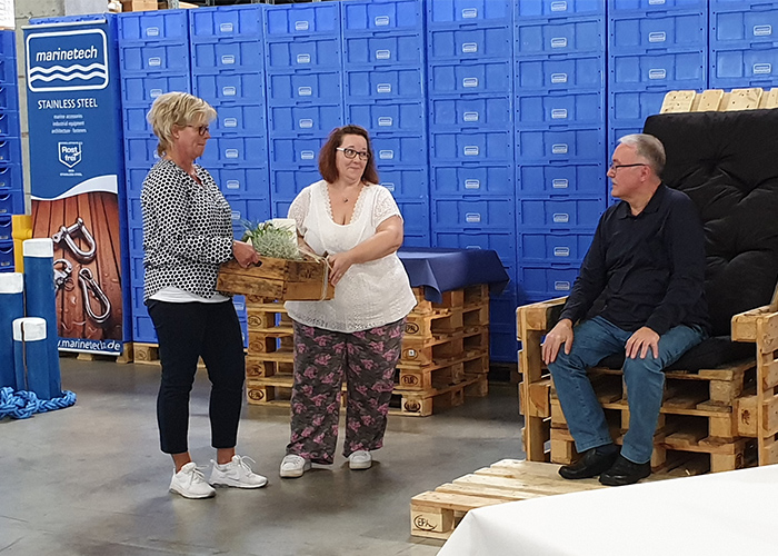 Für eine angemessene Feier hatten wir unsere Lagerhalle zeitweilig in eine Festhalle umfunktioniert, Stühle und Tische aufgestellt und einladend dekoriert. Mitten drin: ein zünftiger Palettenthron. Hier durfte der Ehrengast Platz nehmen, um mit „seiner Crew" gebührend zu feiern, Festreden zu lauschen und Geschenke entgegen zu nehmen. Alle Kolleg*innen hatten sich in einem Fotobuch verewigt, es gab eine „Ruhestandskiste" mit viel gutem Inhalt und auch ein 15 kg Schäkel mit Gravur wird ihn in seinen Ruhestand begleiten.