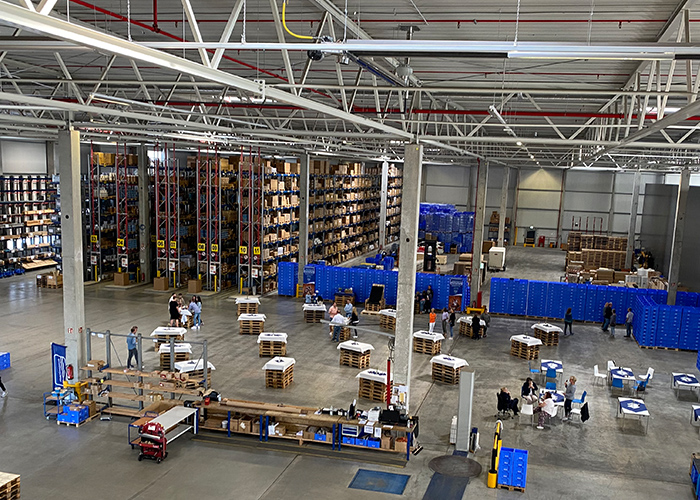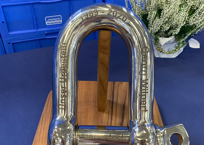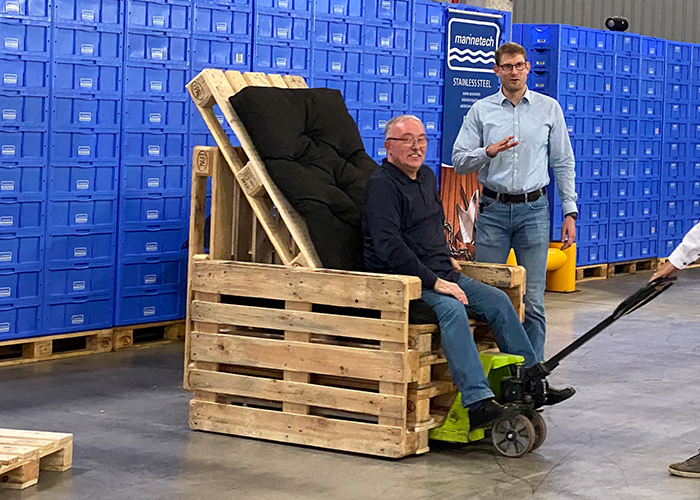 Für eine angemessene Feier hatten wir unsere Lagerhalle zeitweilig in eine Festhalle umfunktioniert, Stühle und Tische aufgestellt und einladend dekoriert. Mitten drin: ein zünftiger Palettenthron. Hier durfte der Ehrengast Platz nehmen, um mit „seiner Crew" gebührend zu feiern, Festreden zu lauschen und Geschenke entgegen zu nehmen. Alle Kolleg*innen hatten sich in einem Fotobuch verewigt, es gab eine „Ruhestandskiste" mit viel gutem Inhalt und auch ein 15 kg Schäkel mit Gravur wird ihn in seinen Ruhestand begleiten.