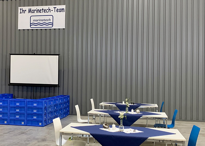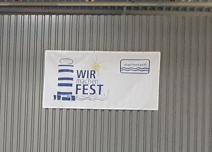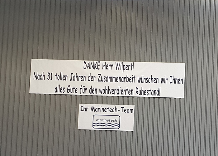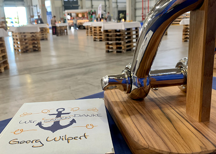 Zum Abschluss wurde Georg Wilpert per Stapler mitsamt seinem Thron und viel Beifall über den Verladehof vor das Marinetech Tor gesetzt. Damit endete der offizielle Part der Verabschiedung und ging in den fröhlichen Teil über: lecker essen und trinken aus dem Foodtruck von Mucha Lucha, über alte und neue Zeiten schnacken und sich an viele aufregenden Marinetech-Geschichten erinnern – kaum einer war dabei, der sich dabei nicht hin und wieder die eine oder andere Träne fortwischte.